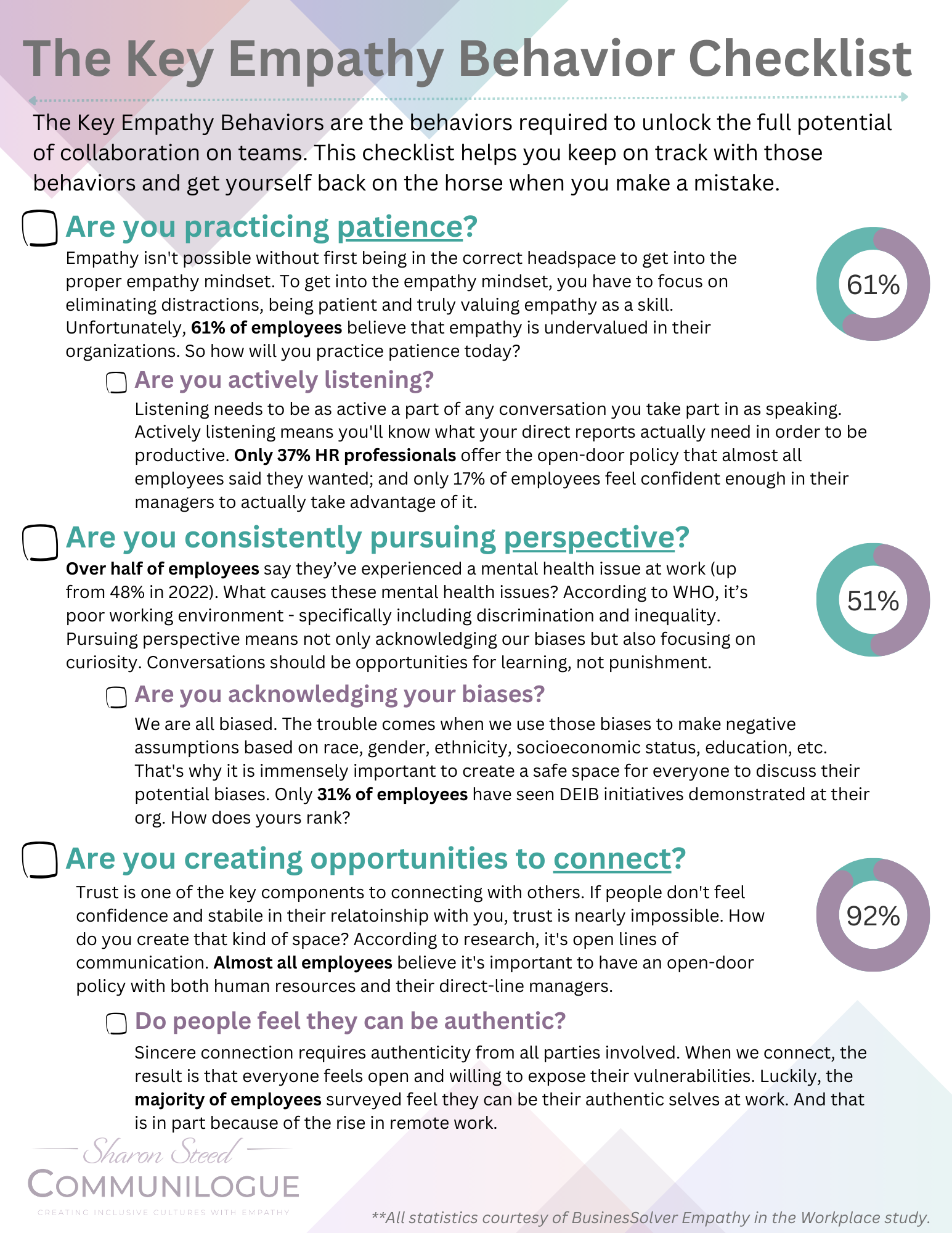 Below is a checklist to help you better engage in empathy actions. If you have any questions, or would like to bring Sharon in to talk to your company, employee resource group, or conference about the Key Empathy Behaviors, reach out to her directly.