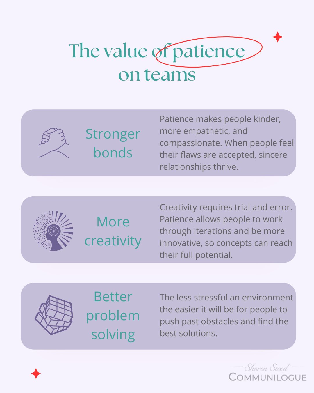 Patience is a great aid in learning not just new skills, but about others. The more patient you are, the more you encourage collaboration. With patience, the focus is on listening. And we should be listening to understand rather than just to respond. As we listen with more intention, we are creating a more collaborative environment because people feel heard. That makes working together a more enjoyable experience for all involved. When people are having fun, they are more equipped to solve problems efficiently. And leaders who demonstrated patience helmed teams who felt more creative and collaborative.